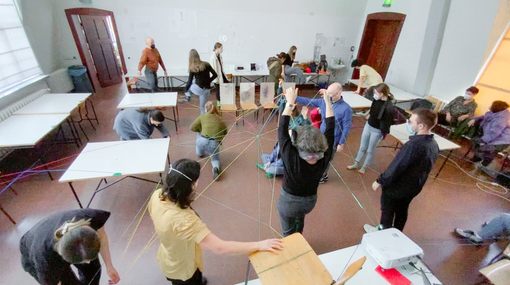 As part of the Bauhaus Spring School 2022, the course BodySpace – SpaceBody, developed and led by Dr. Luise Nerlich (Bauhaus-Universität Weimar) and spatial designer Manolis Iliakis (Athens), invited international students from various disciplines to explore space as an extension of the body. Through lectures, discussions, and physical exercises, the participants were introduced to ways of perceiving and understanding architecture beyond the visual while using all senses and bodily awareness as design tools.